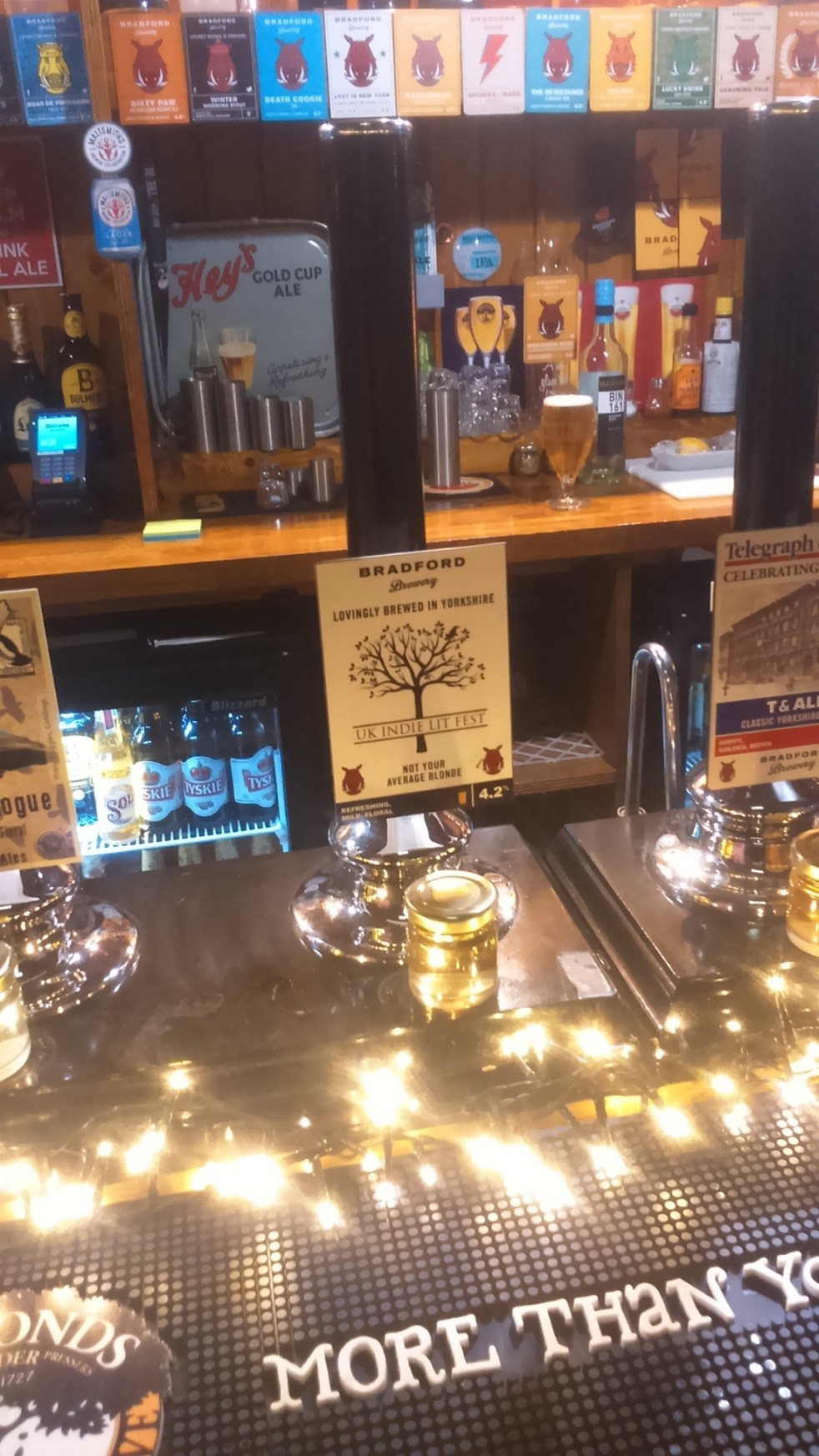 Some of the cast and crew of the UK Indie Lit Fest relax in the Exchange Ale House after a tiring, but rewarding day at the Kala Sangam. Left to right: Peter Singh, Rose English, Chris A Turnbull, Joshua Sutton…